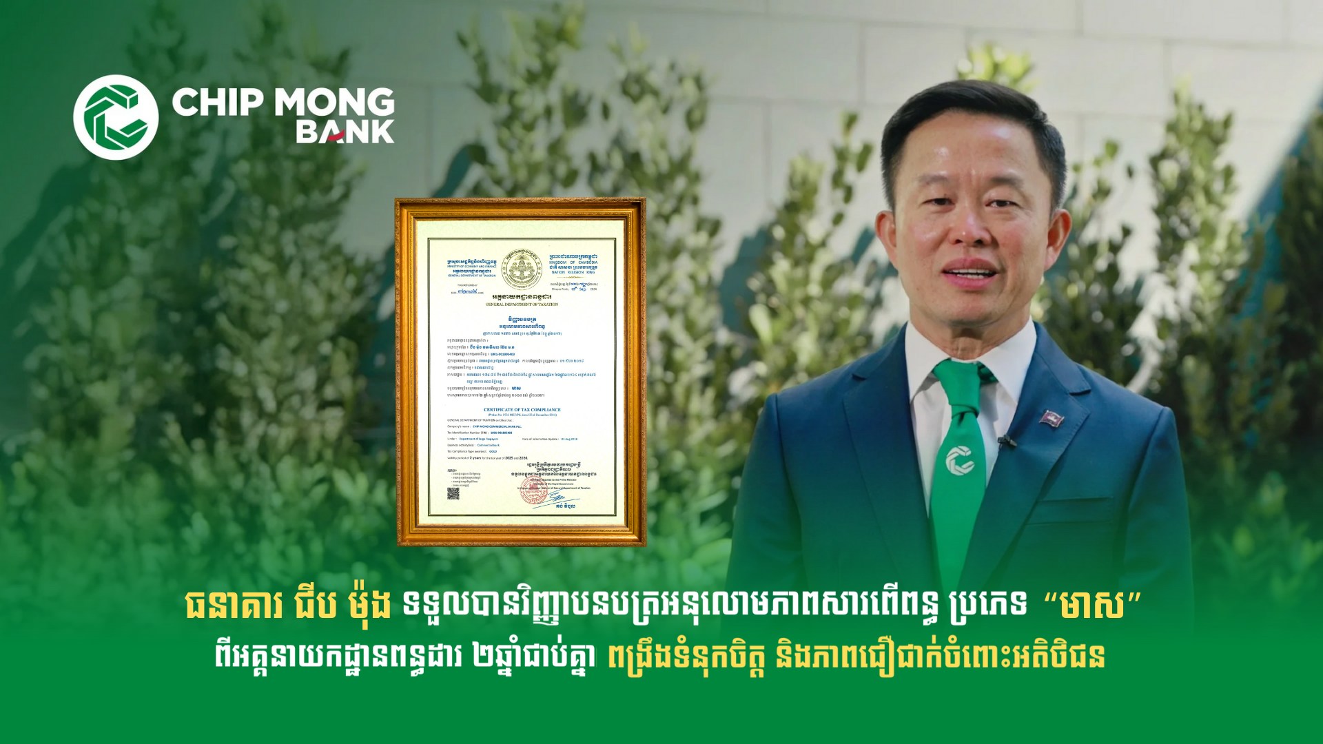 ធនាគារ ជីប ម៉ុង មានមោទនភាពក្នុងការ ទទួលបានវិញ្ញាបនបត្រអនុលោមភាពសារពើពន្ធ “មាស” ពីអគ្គនាយកដ្ឋានពន្ធដារ (GDT) សម្រាប់រយៈពេលពីរឆ្នាំជាប់ៗគ្នា។ ការទទួលស្គាល់ដ៏មានកិត្យានុភាពនេះបង្ហាញពីការប្តេជ្ញាចិត្តឥតងាករេរបស់ធនាគារចំពោះតម្លាភាពហិរញ្ញវត្ថុ តាមបទប្បញ្ញត្តិពន្ធដារ និងការអនុវត្តអាជីវកម្មប្រកបដោយទំនួលខុសត្រូវ ដោយបានពង្រឹងគោលជំហររបស់ខ្លួនជាធនាគារដែលប្រជាពលរដ្ឋខ្មែរអាចទុកចិត្តបាននៅក្នុងប្រទេសកម្ពុជា។