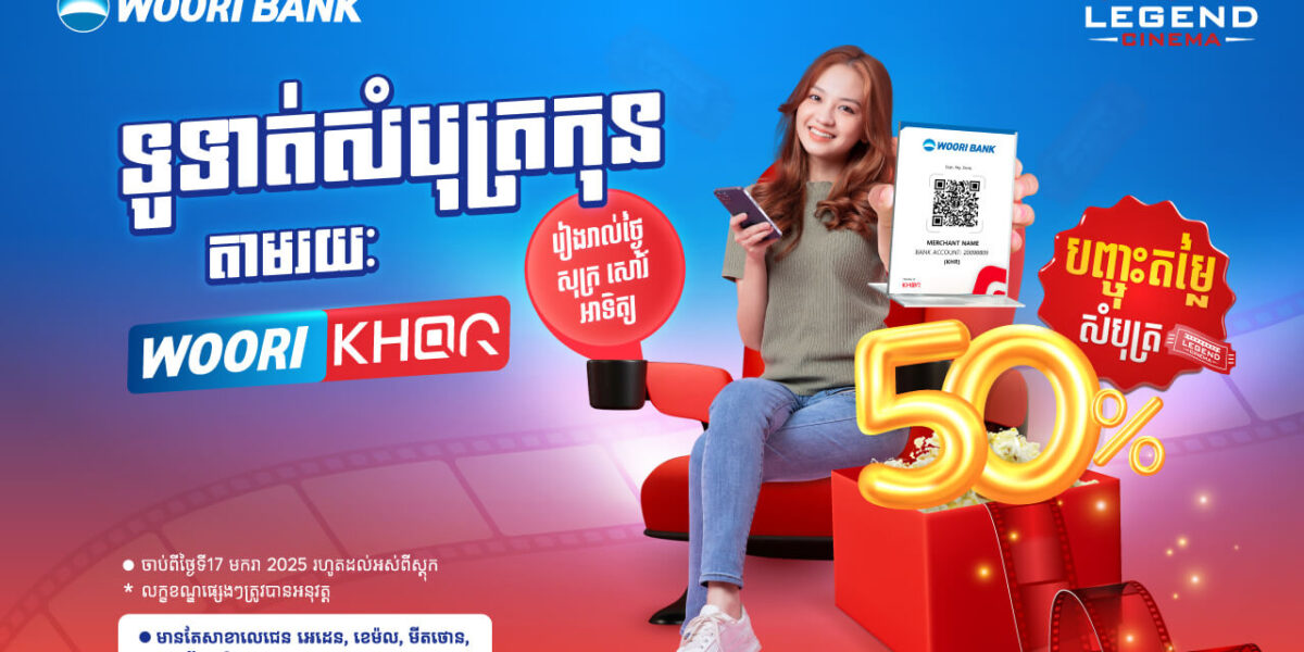 ធនាគារ អ៊ូរី (Woori) បានធ្វើការបញ្ចុះតម្លៃរហូតដល់ទៅ50% ភ្លាមៗនៅតាមបណ្តារោងកុន Legend Cinema ដោយគ្រាន់តែអតិថិជនថ្មីចាស់ទូទាត់ថ្លៃសំបុត្រតាមរយៈ Woori Bank Mobile ។